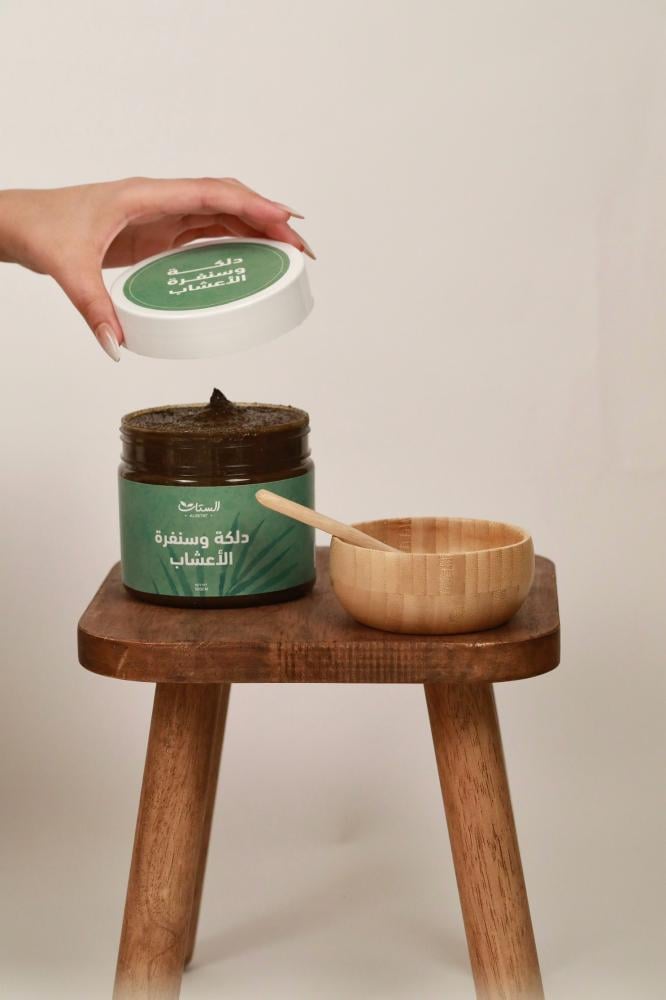 ✨أثناء الشور: كماسك عشبي مخفف بالماء او الحليب ١٠ دقائق ثم يشطف